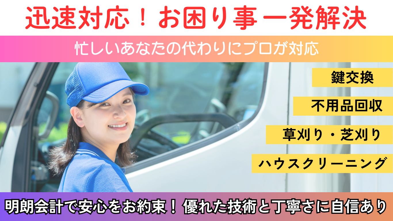 不用品回収、ハウスクリーニング、庭の手入れ、鍵の交換など、暮らしのあらゆる「困った」に対応します。まずはお気軽にご相談ください。その他のご依頼についてもお気軽にご相談下さい。