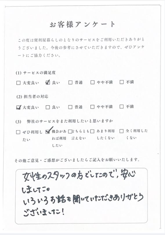 男性を自宅に入れるのは抵抗があるという不安を解消するため、女性スタッフが在籍しています。ご希望に応じて清掃や整理整頓などの繊細な作業は女性スタッフが担当いたします。